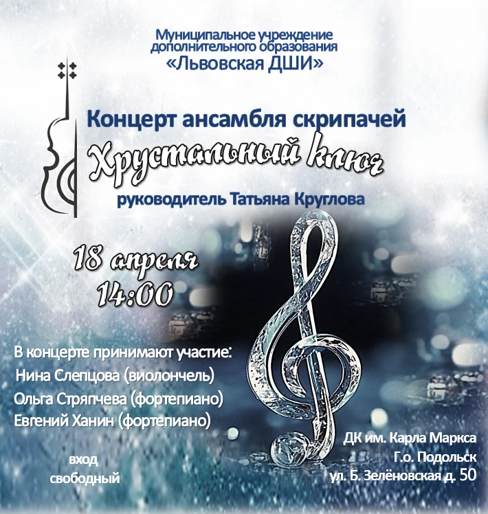 18 апреля состоялось музыкальное событие — концерт ансамбля скрипачей «Хрустальный ключ», под руководством Татьяны Николаевны Кругловой. Возвышенное и трогательное звучание скрипок окутало зал, трогая самые тонкие струны души. Юные исполнители не оставили равнодушным никого в зале: многие зрители не смогли сдержать слёз умиления, настолько глубоко их затронуло выступление. В концерте участвовали выпускники Татьяны Николаевны, окончившие …