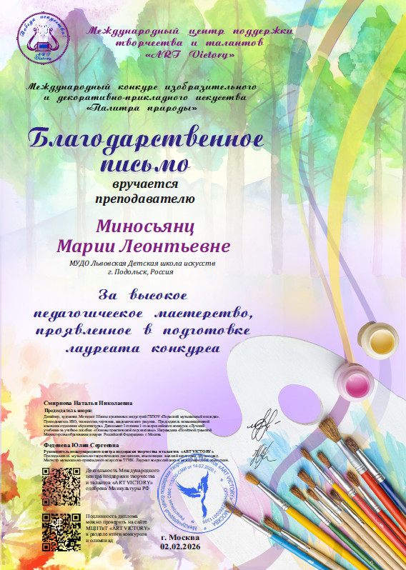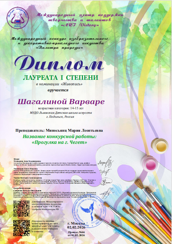 Поздравляем Варвару Шагалину, лауреата I степени Международного конкурса изобразительного и декоративно-прикладного искусства «Палитра природы»!